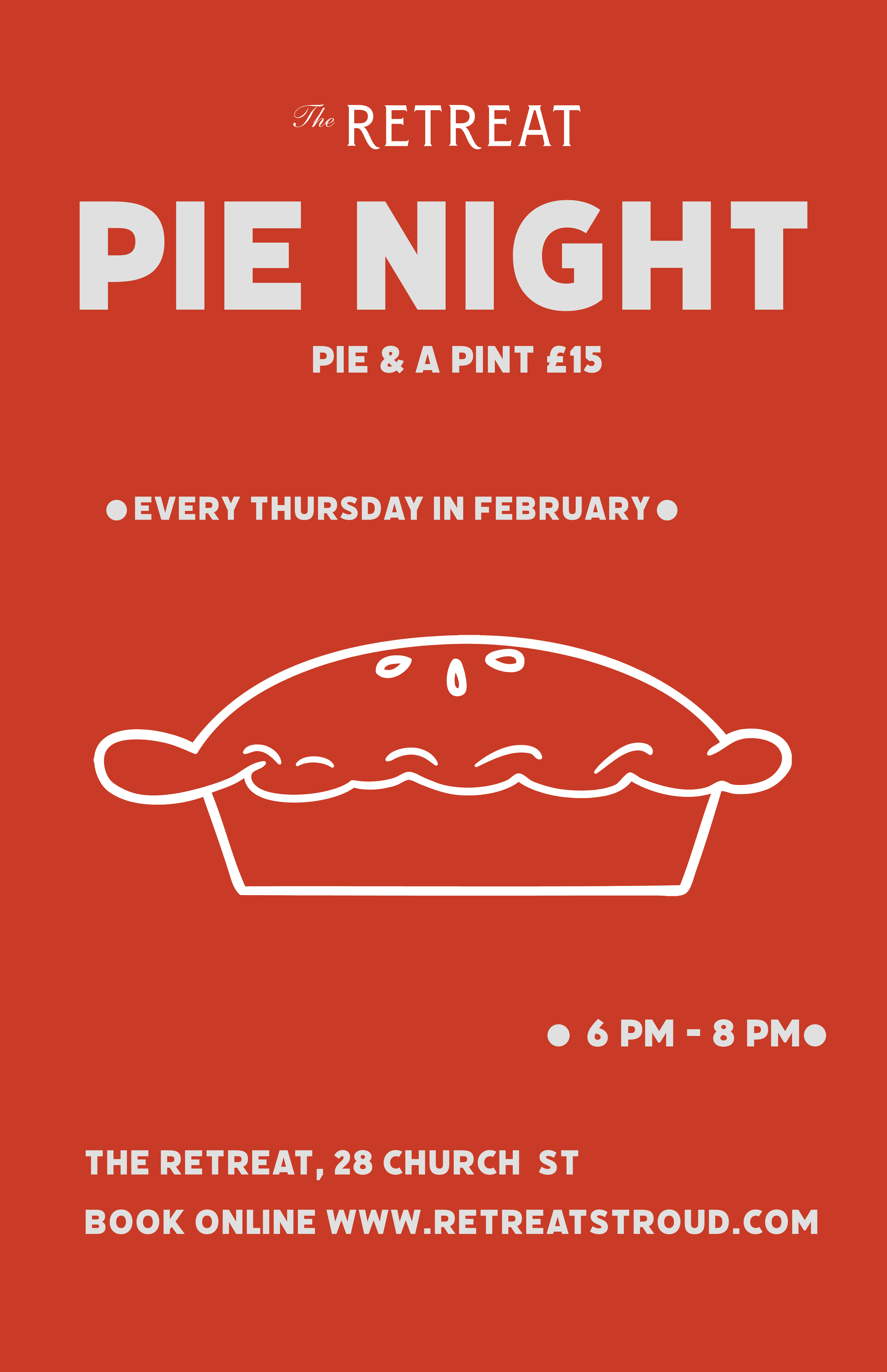 Every Thursday in February we’ll be serving up pies and a pint for £15 from 6pm - 8pm. Booking online is encouraged.